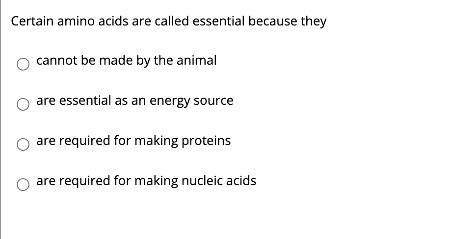 Certain amino acids are called essential because they a cannot be made by the | Course Hero